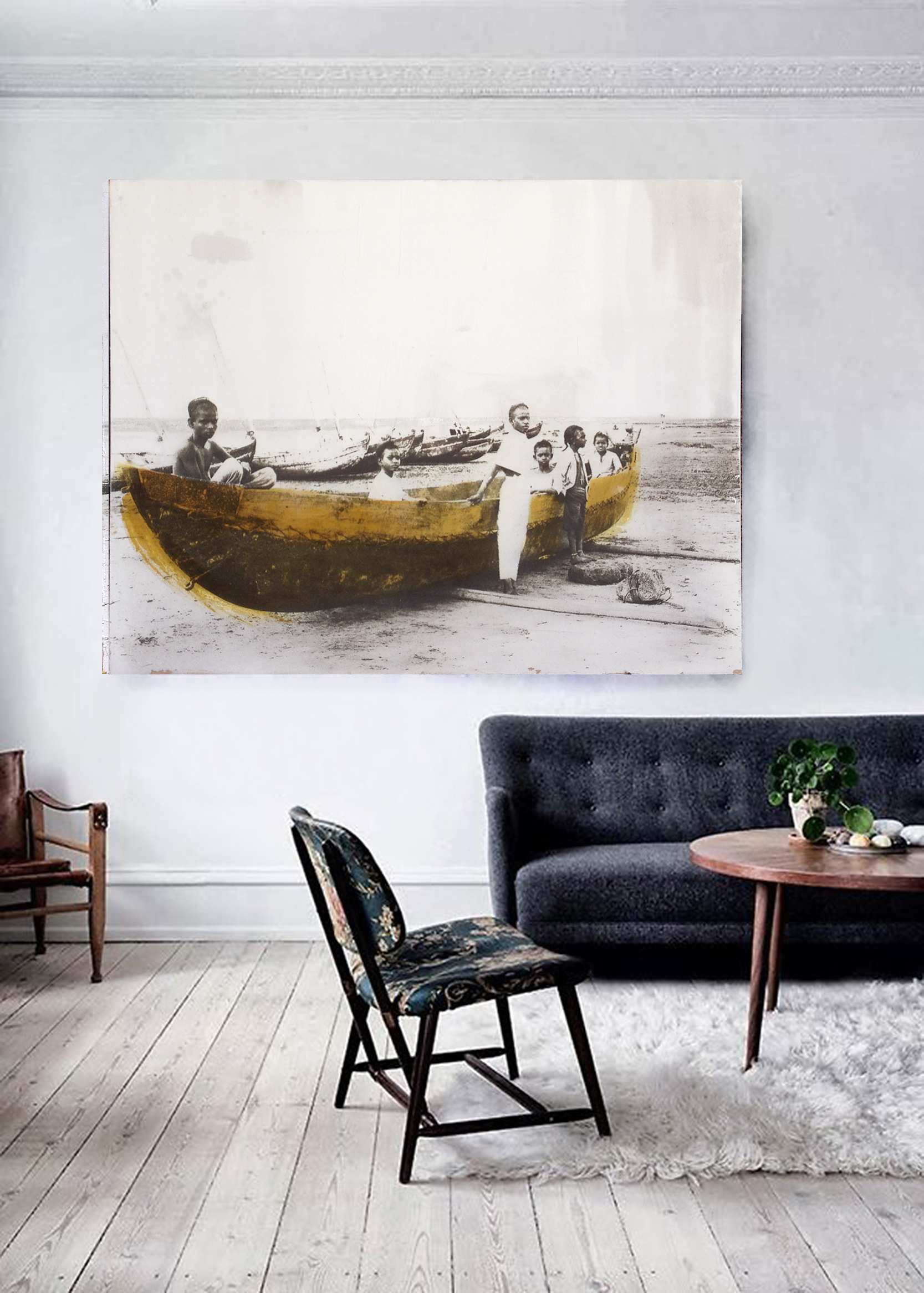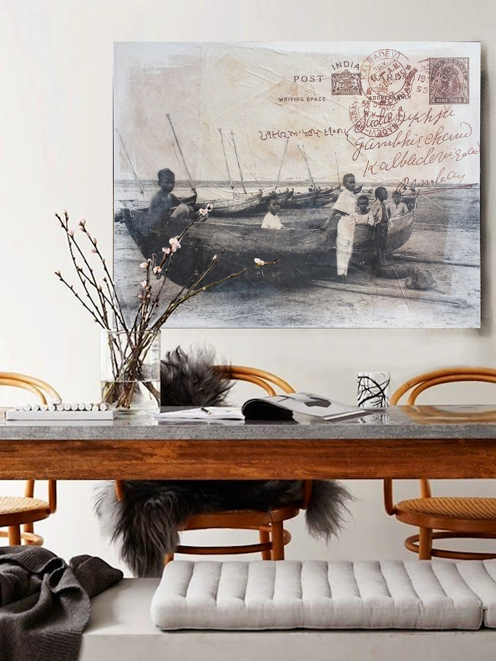 ambiance Inde timbreLes enfants de Titucorin.  79,5 x 100 cm. Panneau en Médium, papier népalais, acrylique, surimpression de texte et timbres d’origine.  *
