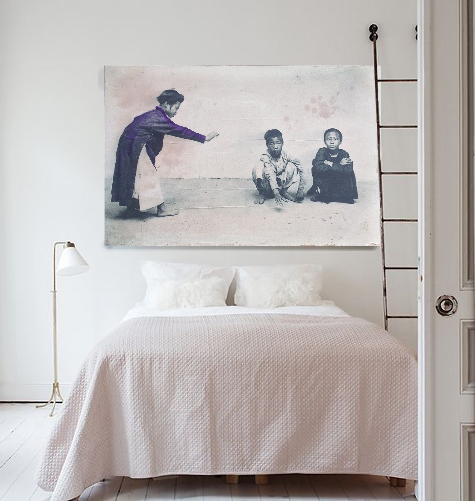 ambiance SapèquesTonkin, enfants jouant aux sapèques. 100 x 65cm  Panneau de Médium, enduit, lavis et encre.